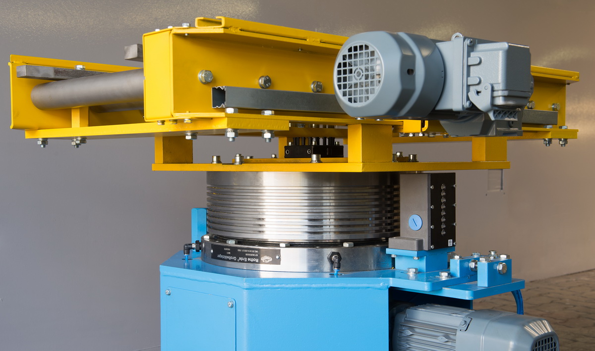 Anforderungen: Dreht Werkstück in Lage Antrieb über Innenverzahnung Vierpunktlager  Abschaltung über Initiatoren in Nutentrommel Technische Merkmale: Fördergut: ZKG und ZK Förderlast bis 400 kg Abschaltung über induktive Sensoren mit Nutensteinen in Nutentrommel  universell einstellbar
