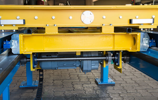 Ein wichtiger Bestandteil unserer Transportverkettungen sind neben Rollenbahnen und Drehtischen die Verfahrwagen, die das Verteilen von Werkstücken, Paletten o.Ä. auf verschiedene Förderstrecken ermöglichen. Sie haben eine Traglast von bis zu 1200 kg/m und bieten eine optimale Raumnutzung. Antriebsart und Energiezufuhr können je nach Bedarf gewählt werden.